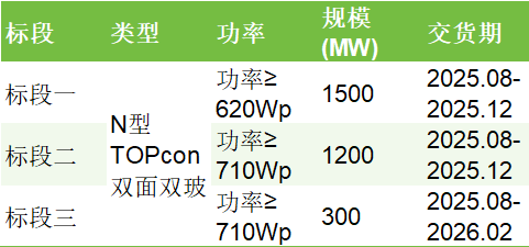 标段三:采购总容量为300MWp的 N型TOPcon双面双玻单晶组件,组件尺寸:2384×1303×35mm,电池片尺寸:210×210mm,功率≥710Wp。预计交付时间2025年8月-2026年2月。
